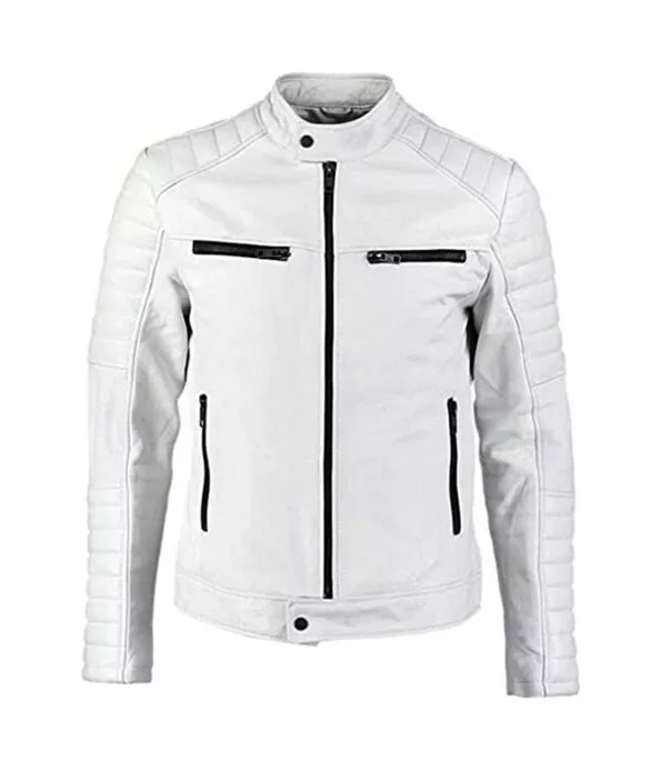 Do you love wearing motorcycle outfits to make your rides more fun? This time, we have something extra for you. It is Men Lambskin White Jacket which is a great clothing option for you. It has been manufactured with lambskin leather is good quality material and durable fabric. It contains viscose lining inside as well. The overall Biker Genuine Leather White Jacket is in white but the black detailing on the zippered front closure looks fascinating. The stand-up collar is enclosed with the button. It has full sleeves with zippered cuffs. There are two side pockets at the waist and two pockets at the chest.