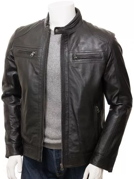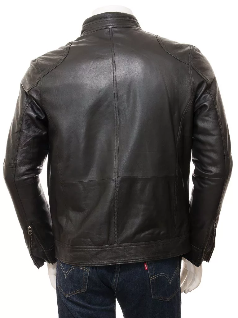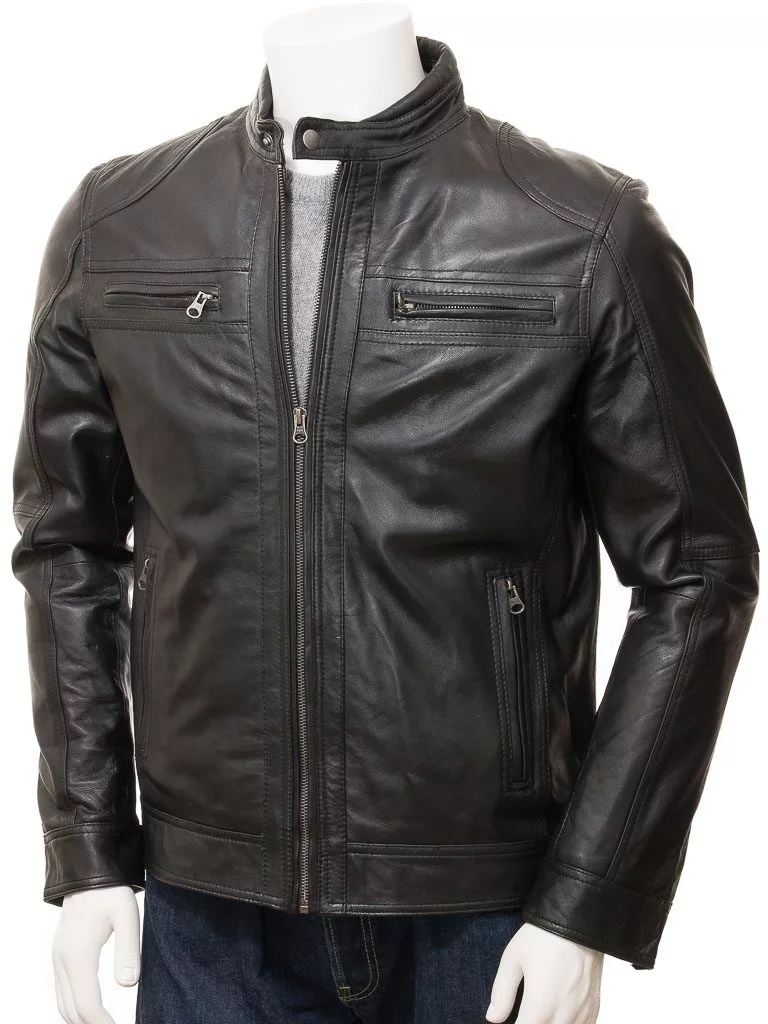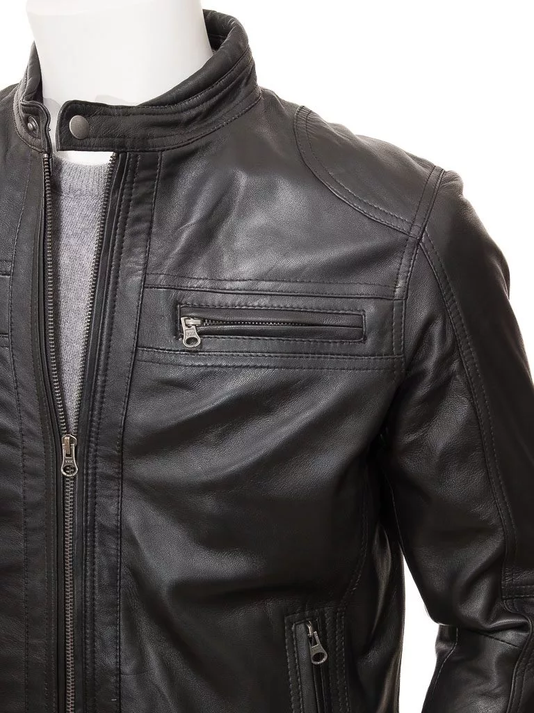 Stuff your range of ensembles with our recommendation which has nicely been designed with premium quality leather for the ever-lasting endurance and the interior of the apparel has been lined with soft satin for a comfortable carry. The collar has a standing feature and there are two zipper pockets at chest along with upright zipper pockets at waist with two internal pockets. The front closure has a zip for fastening promptly and for the safety of extreme cold, full sleeves with zipper cuffs are also provided in this black-colored jacket.