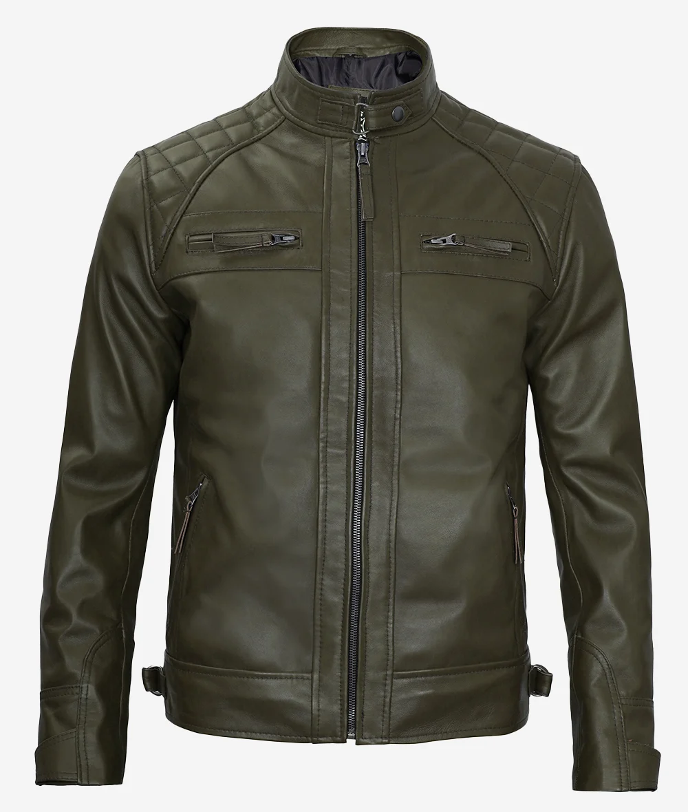Mens Quilted Shoulder Military Green Cafe Racer Leather Jacket