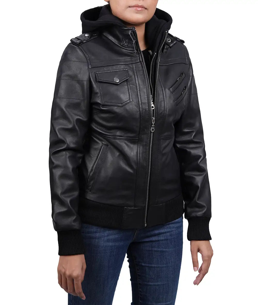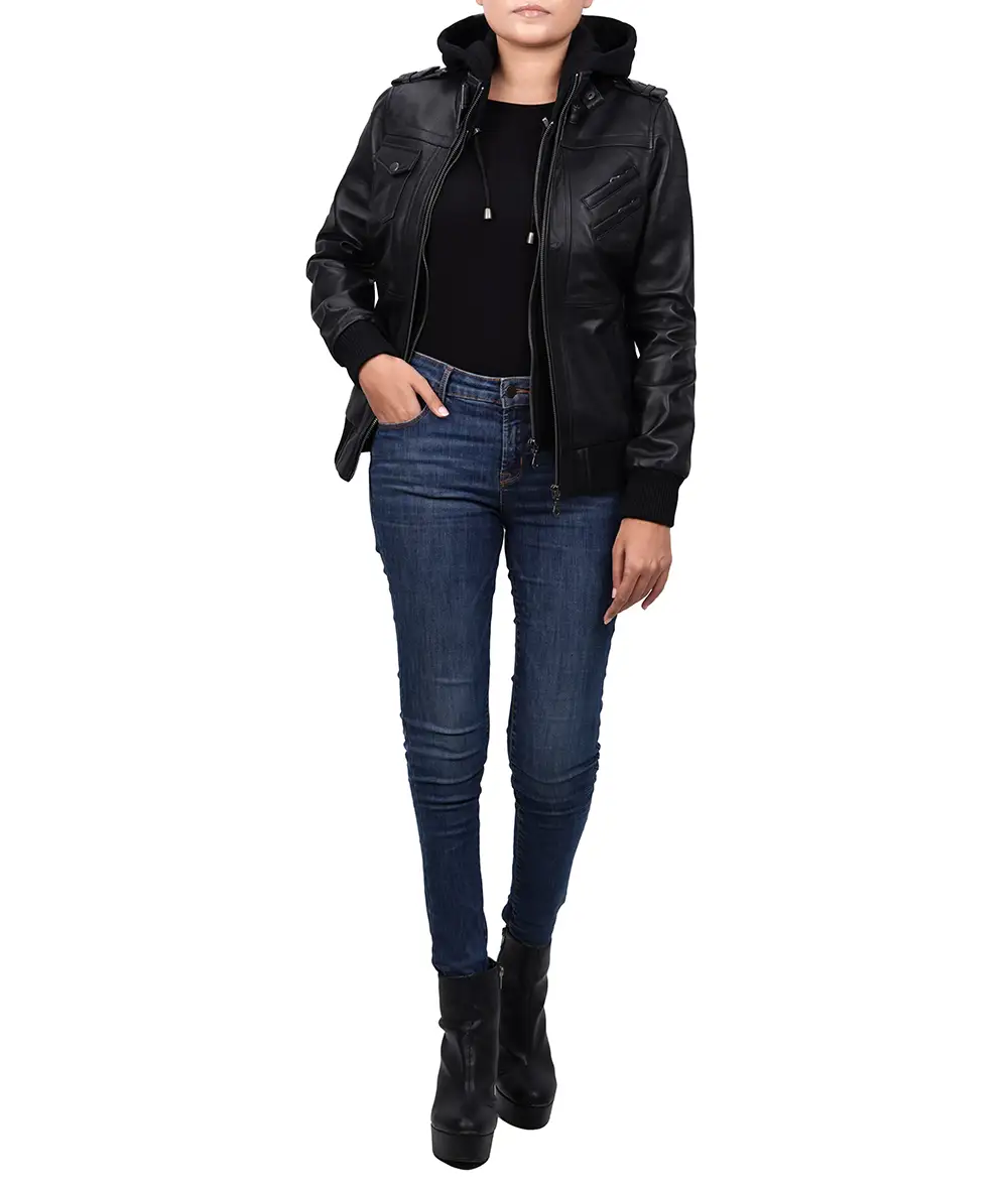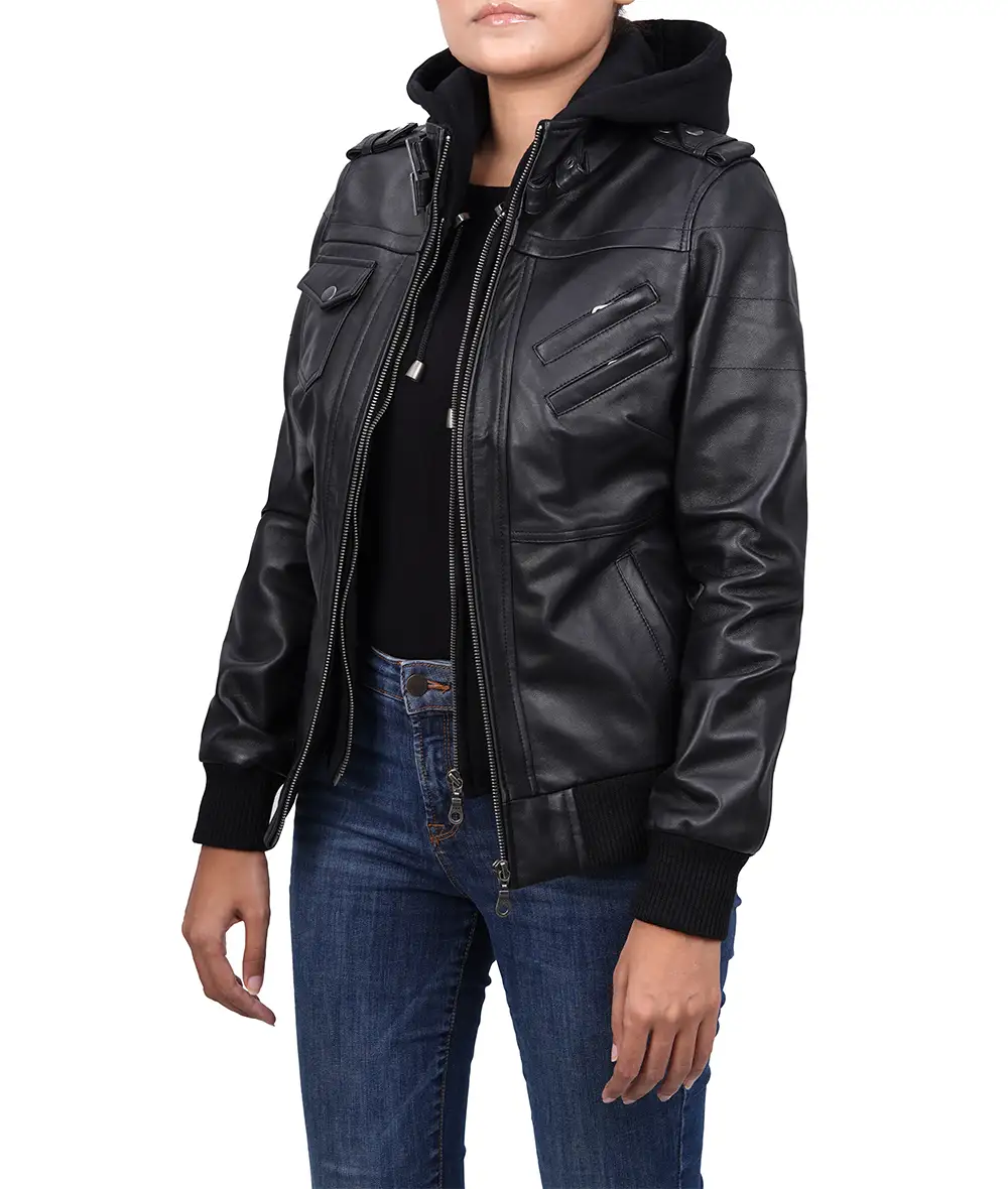 Redefine your wardrobe with our Women’s Black Leather Bomber Jacket. Designed with a nod to aviation heritage, this jacket combines the rugged appeal of bomber jackets with the added versatility of a detachable hood. Whether you’re taking to the skies or the streets, ensure you do so with unmatched style.
