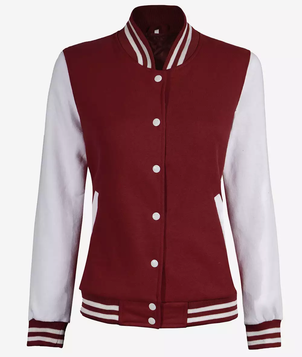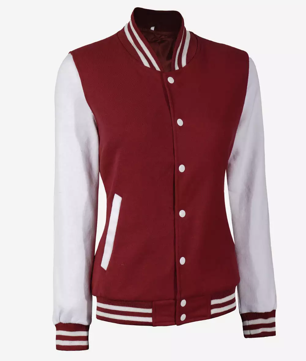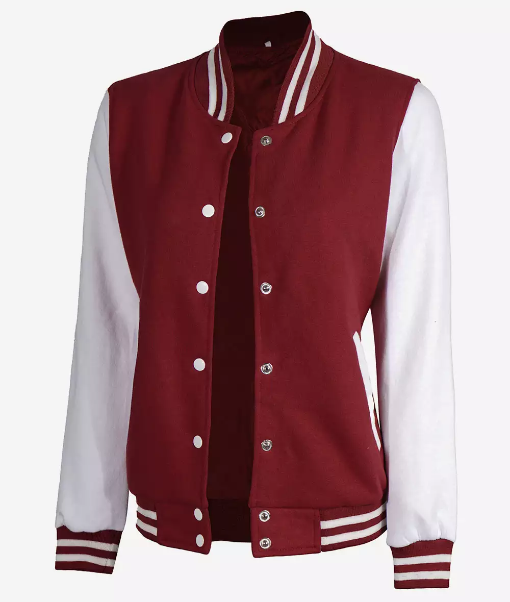 Womens Maroon Varsity Jacket with White Sleeves – Baseball Bomber Jacket