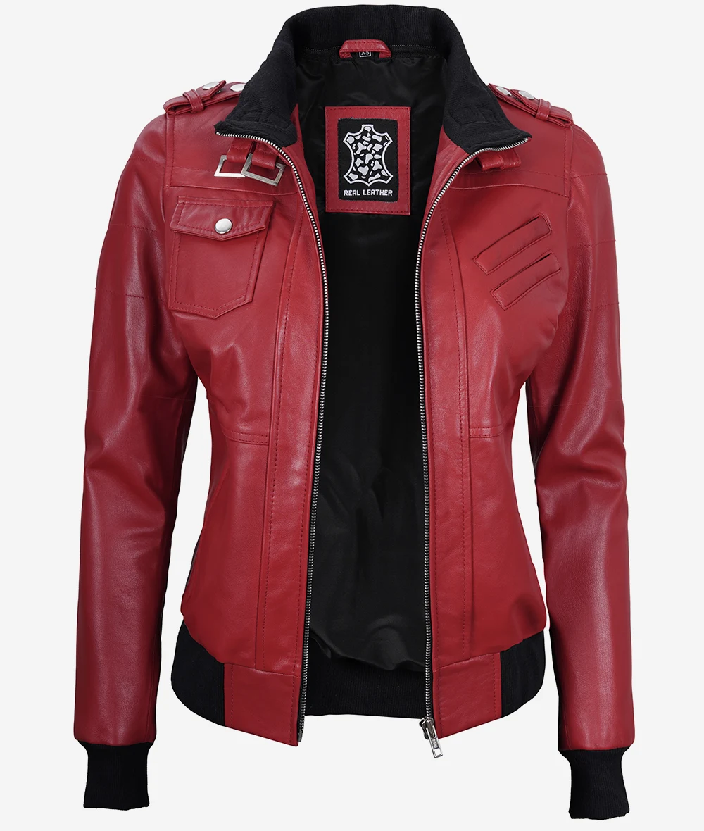 Redefine your wardrobe with our Women’s Red Leather Bomber Jacket. Designed with a nod to aviation heritage, this jacket combines the rugged appeal of bomber jackets with the added versatility of a detachable hood. Whether you’re taking to the skies or the streets, ensure you do so with unmatched style.